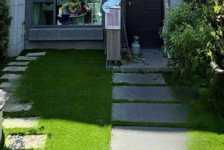 採用台灣製造的人工草皮,讓庭園步道與綠地更易維護,提升整體戶外空間的自然度與乾淨質感